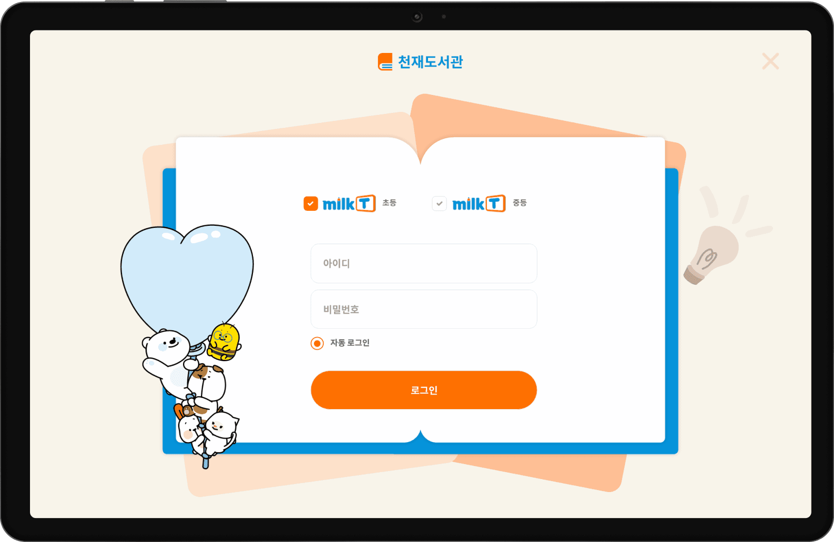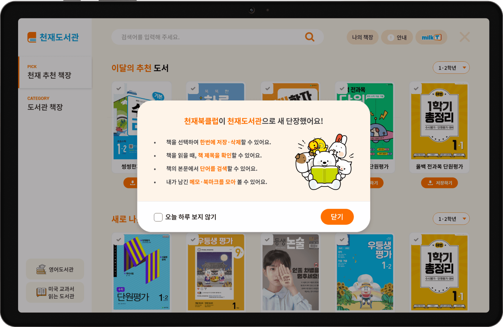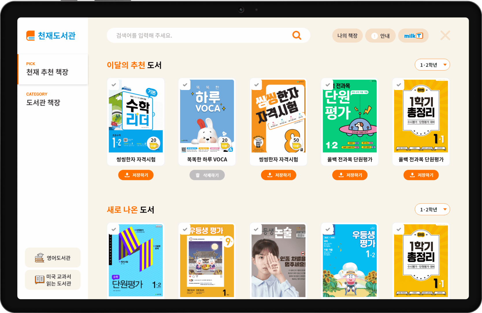 천재교육에서 서비스 중인 밀크T APP 내 초등학생 전용 디지털 도서관 서비스입니다.