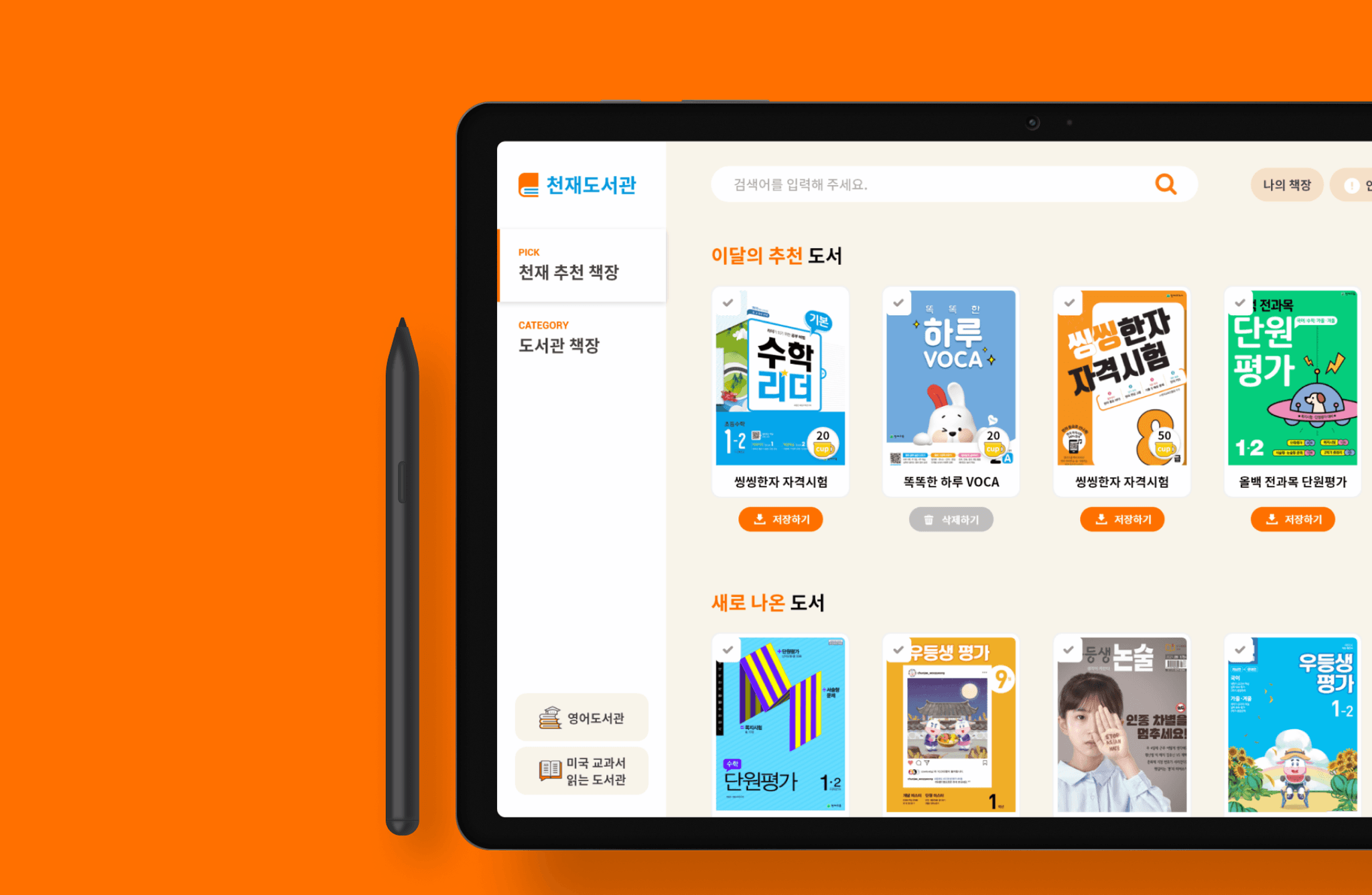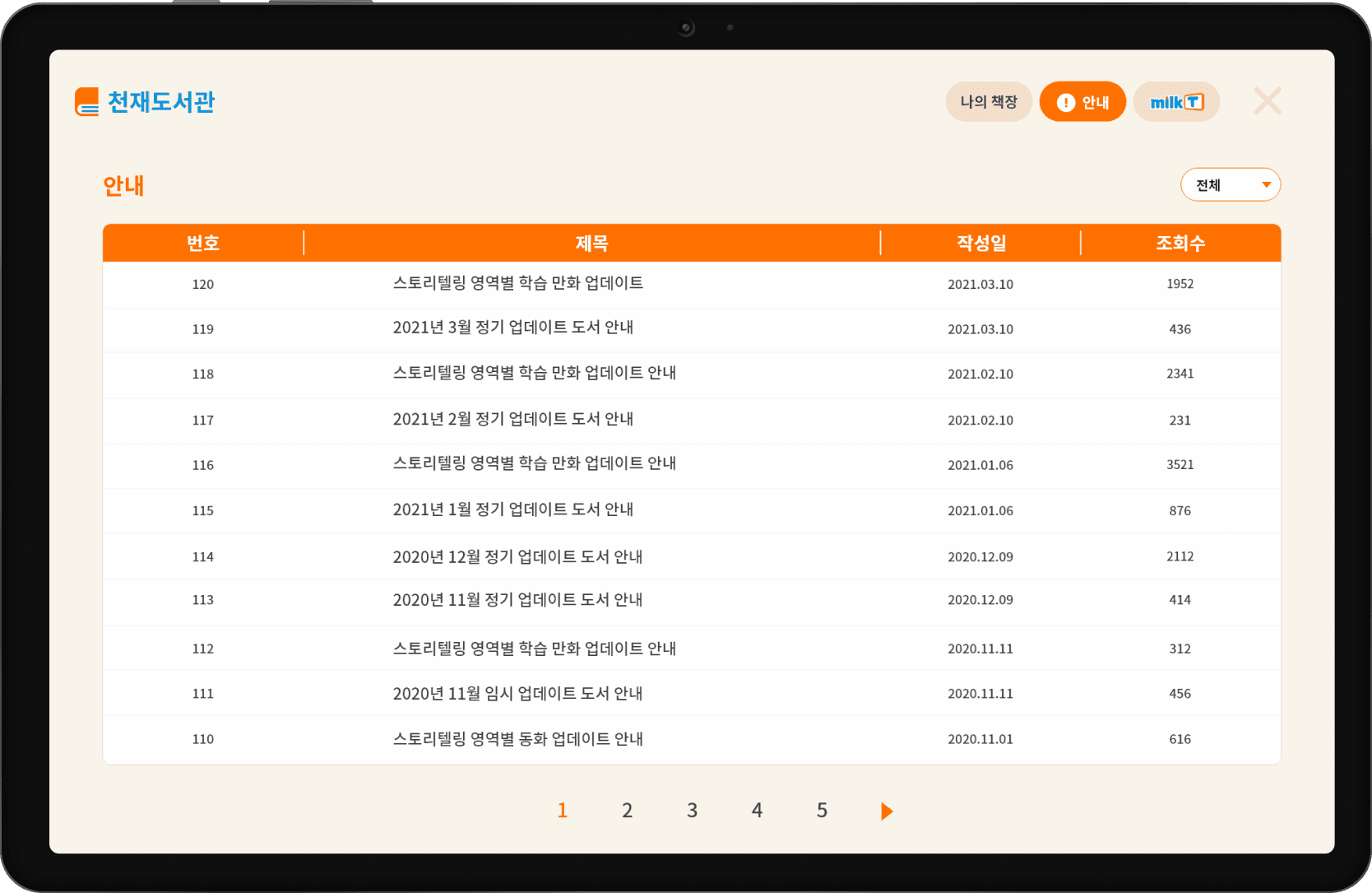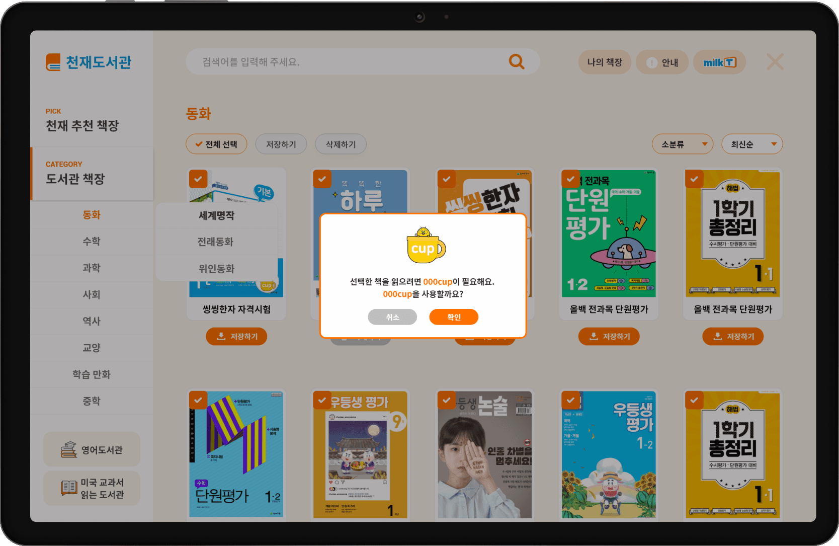 천재교육에서 서비스 중인 밀크T APP 내 초등학생 전용 디지털 도서관 서비스입니다.