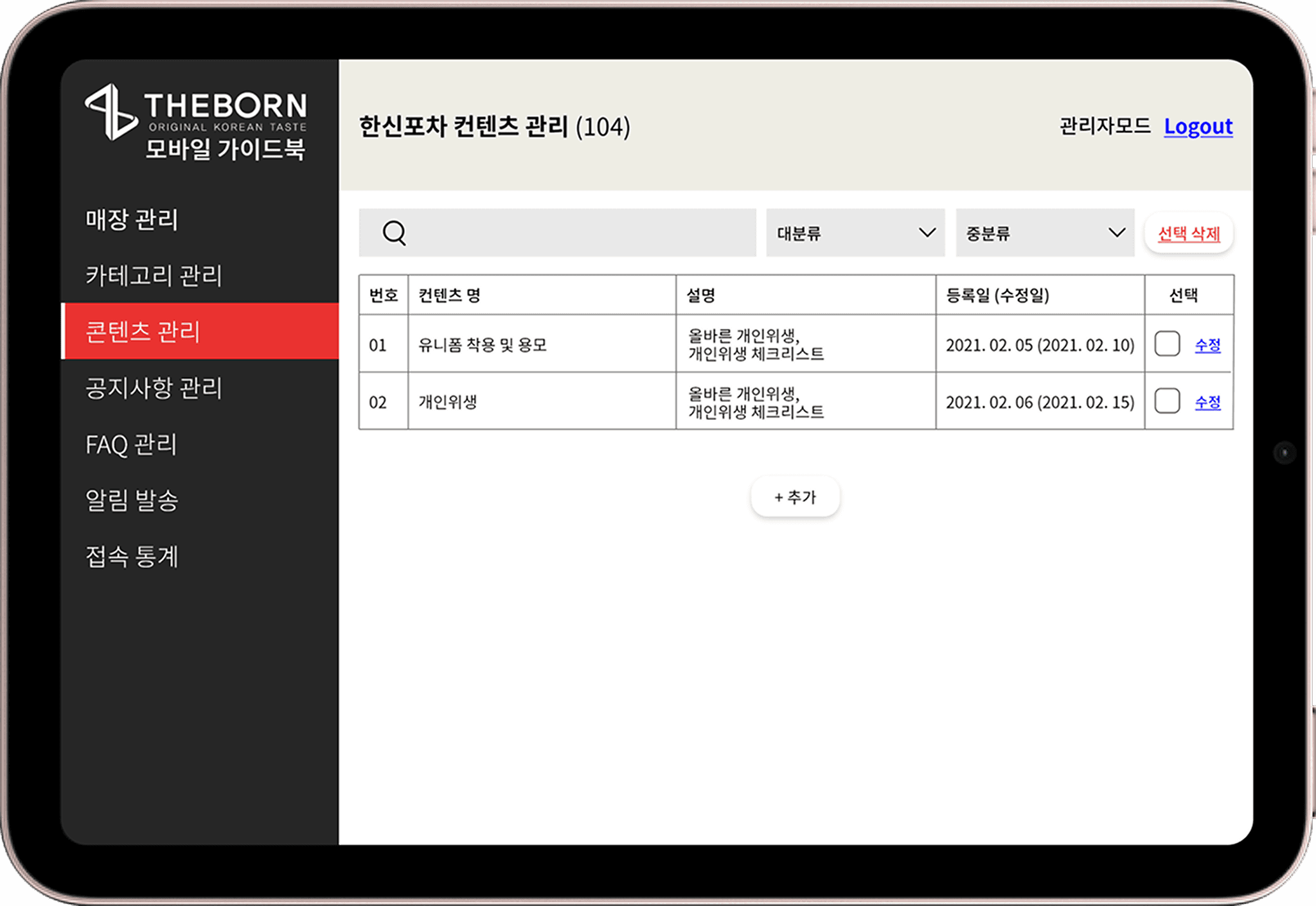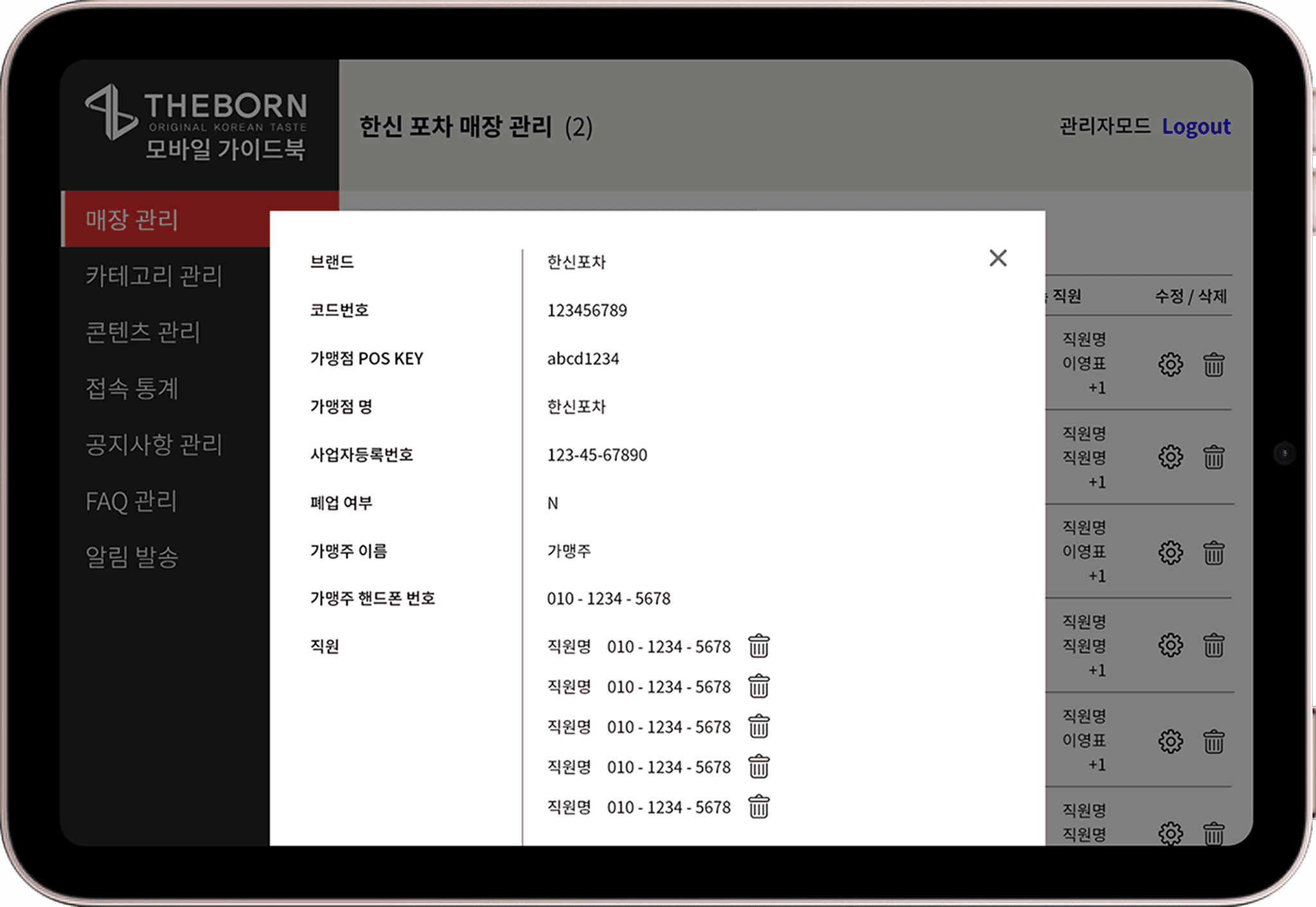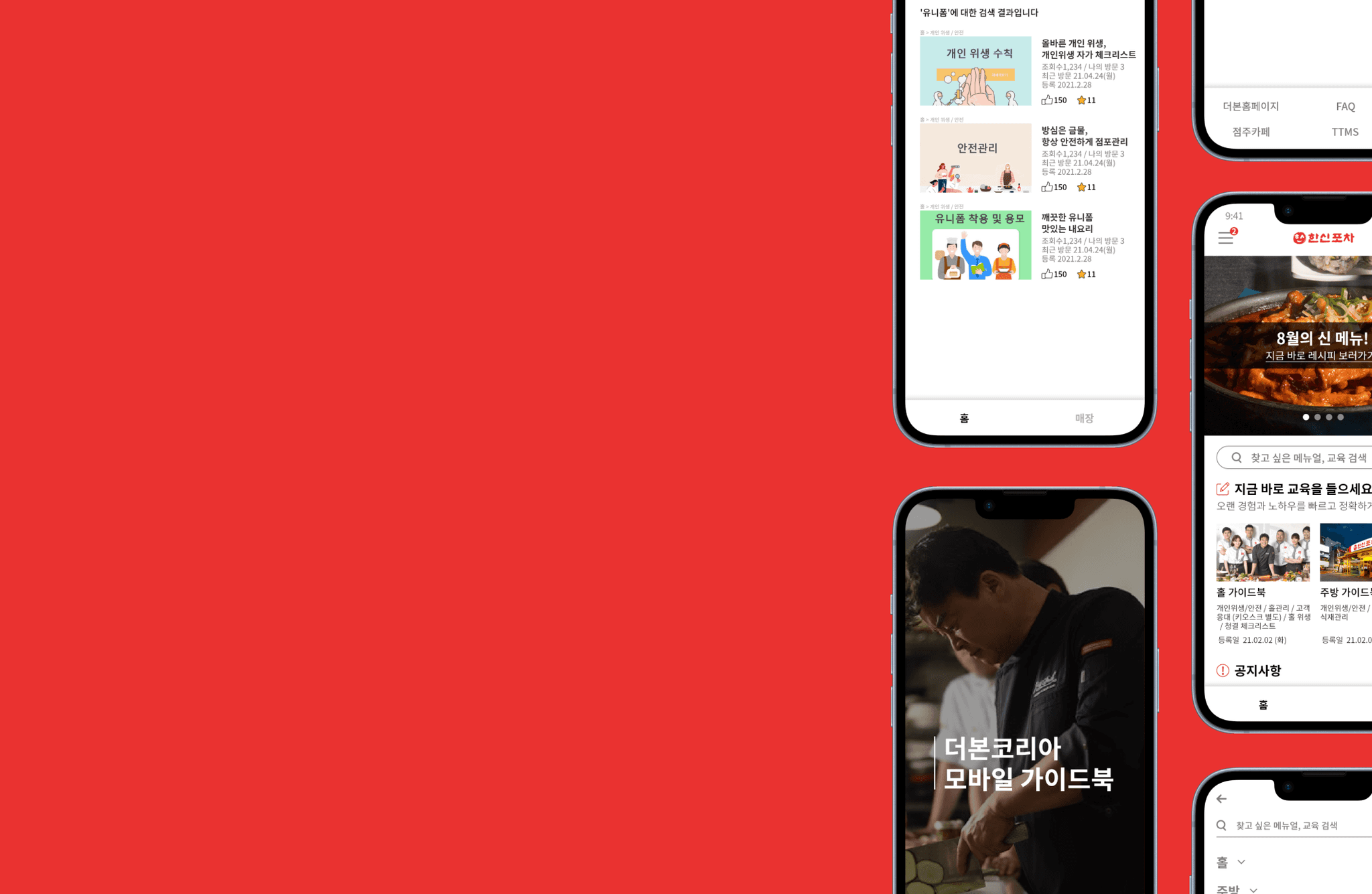 교육 콘텐츠를 본사에서 관리하고 점주 및 점원들이 빠르고 효과적으로 교육하기 위한 서비스입니다. 사용 중인 LMS 내 등록된 점주만 회원가입이 가능하며, 각 프렌차이즈 별 확인 가능한 콘텐츠가 제한됩니다. 제작한 400여개의 콘텐츠 보안을 위해 AES-256, 워터마크, Web 인쇄 방지가 적용되어 있습니다. 서비스는 관리자 페이지, 메인 APP(iOS, Android)으로 구성했습니다. 권한은 총 3가지로 구성되어 있으며, 각 계정별 기능은 다릅니다.